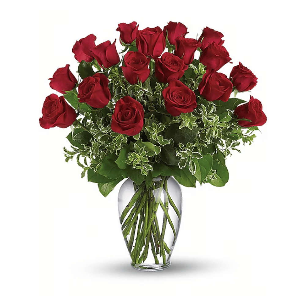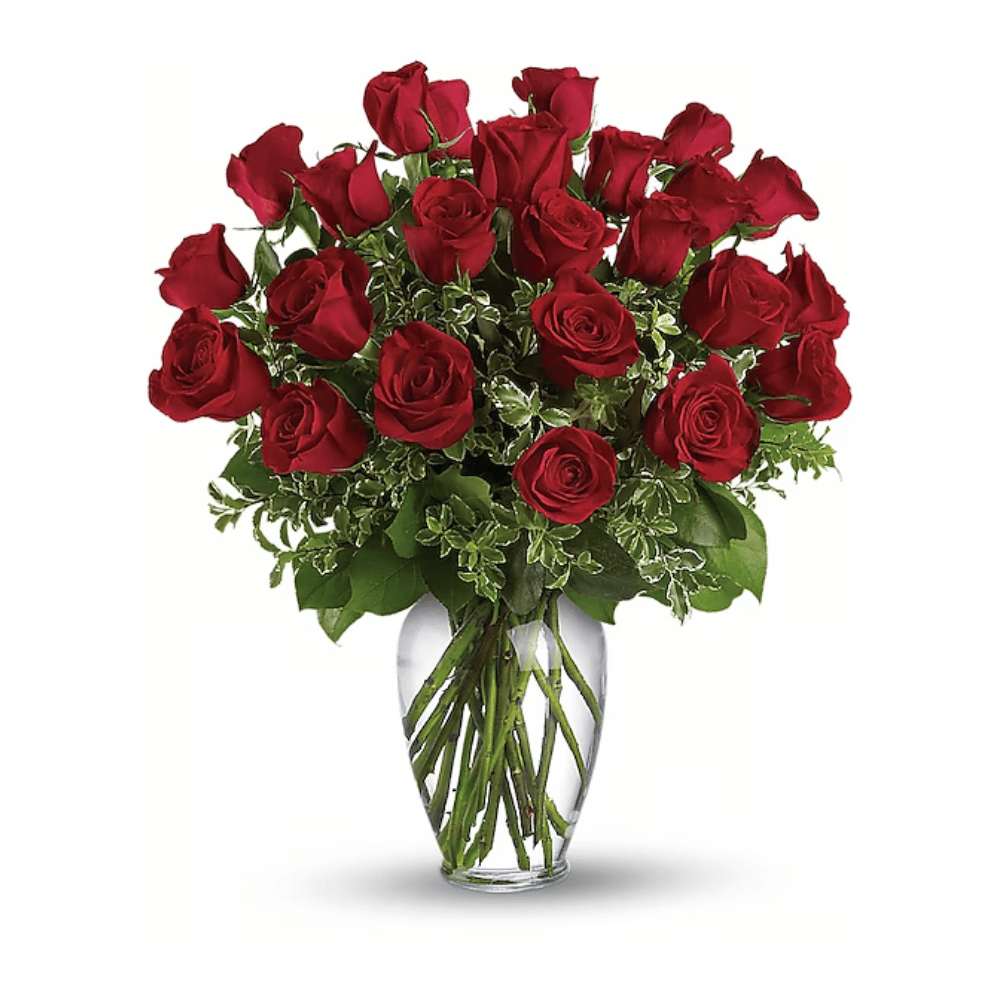 Say "I love you" by sending this lovely arrangement of twelve radiant red roses and fresh greens delivered in a beautiful spring garden vase. Love always.