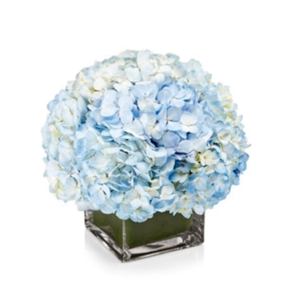 A compact design featuring only cool blue hydrangea, elegantly arranged in a modern vase.