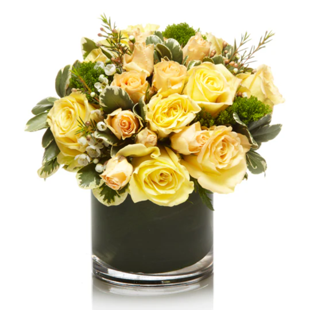 A soft floral arrangement of light yellow and cream blooms, accented with seasonal greenery.