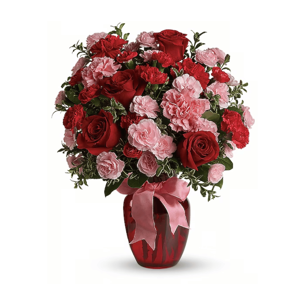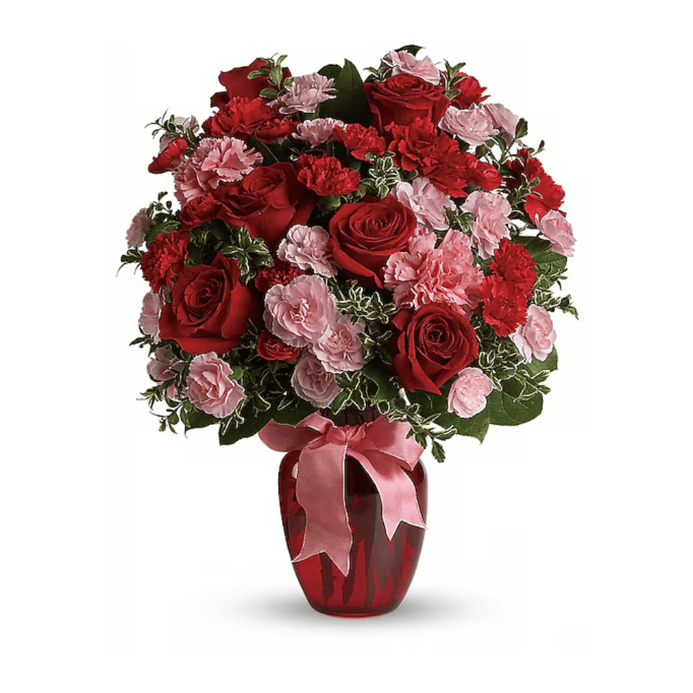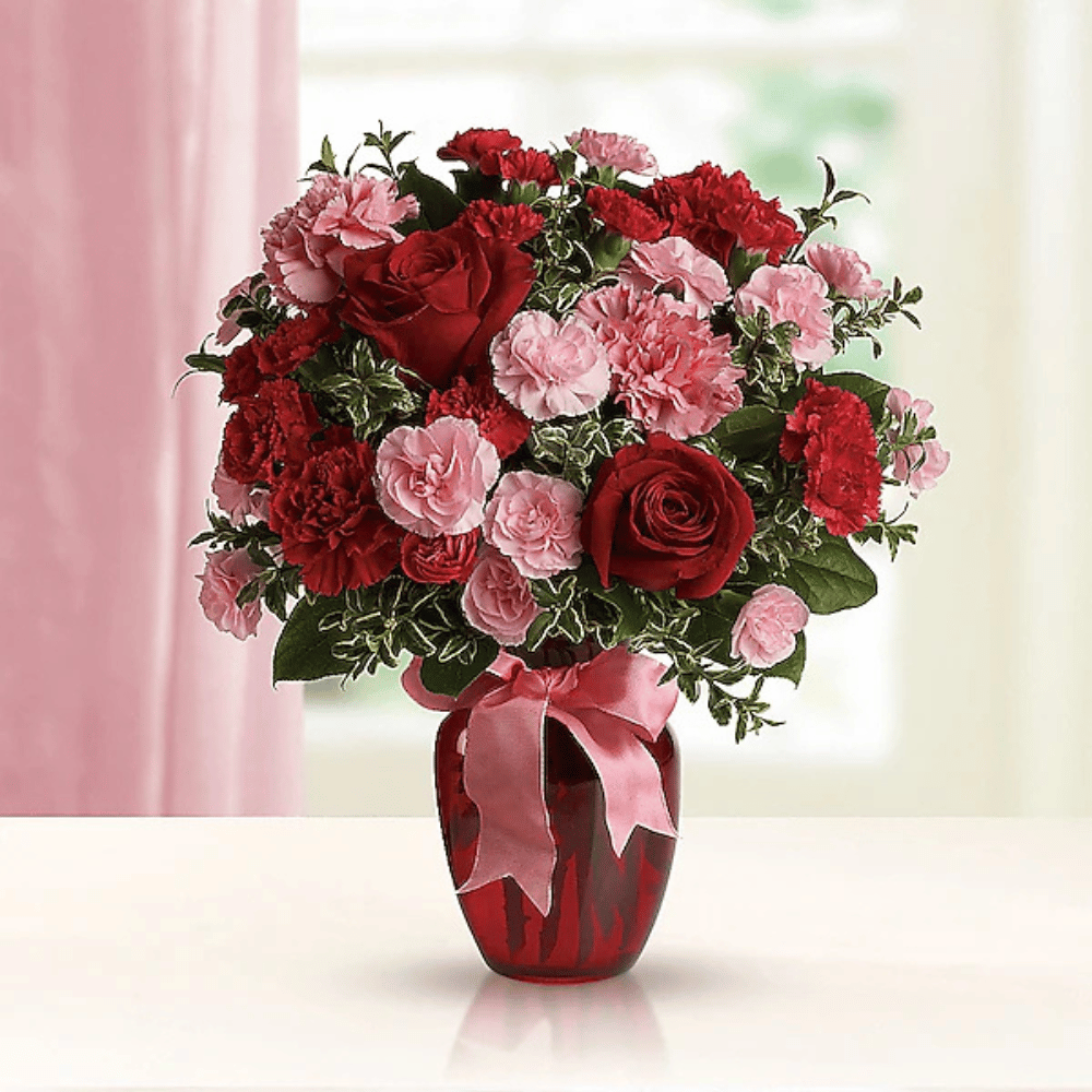 A mix of carnations and roses in shades of red and light pink. Delivered in a glass vase accented with pink satin ribbon.