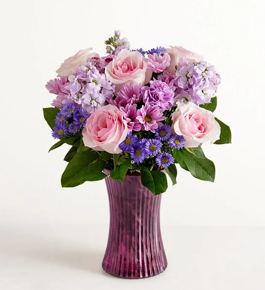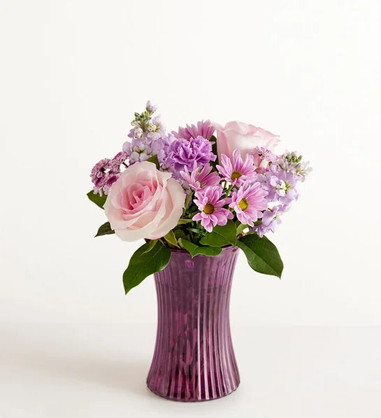 Artistically designed in our exclusive fluted gathering vase in a lovely shade of violet; vintage pressed glass with ribbed detail creates a charming enhancement for the floral arrangement; measures 7.9"H x 5"D
