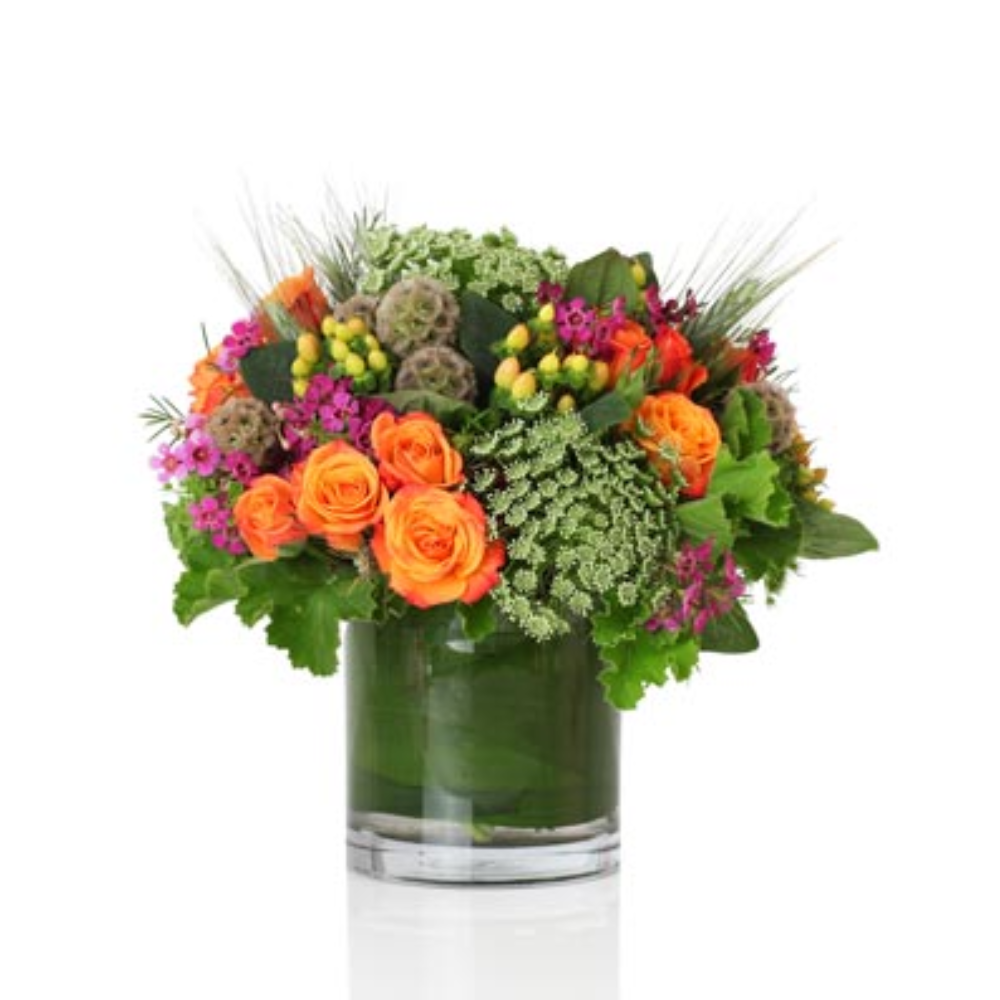 A low and lush garden style flower arrangement featuring orange and magenta blooms, accented with seasonal wildflowers and greenery.