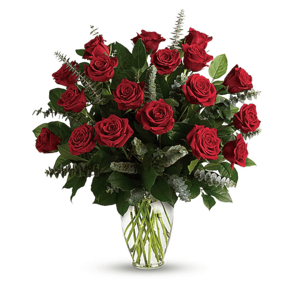 This bouquet features 12 red roses arranged with spiral eucalyptus and lemon leaf. Delivered in a clear glass vase.