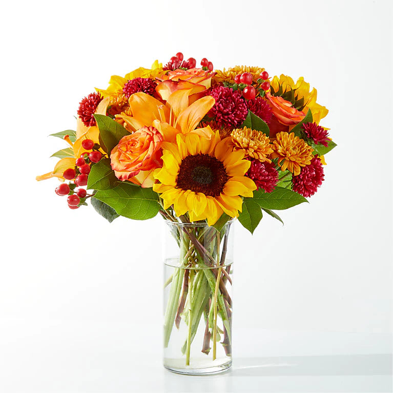 Capturing the beauty of the season, the Fall Day Bouquet brings all the warmest tones with sunflowers, roses and lilies.