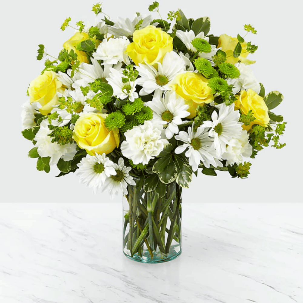 It's amazing the effect flowers can have on its recipient. Through a collection of yellow roses and luminous bupleurum all set within a recycled cylindrical glass vase, our Happy Day bouquet is sure to bring a smile to the face of whoever it's given to. Add the combination of white daisy pompon and green button pompon, and you’ll be making their day brighter with each sunny petal.