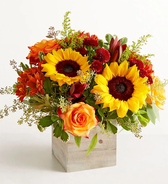 All-around arrangement with red button poms and leucadendrons, autumn-color roses, sunflowers, and rust-color daisy poms, accented with seeded eucalyptus and assorted greenery