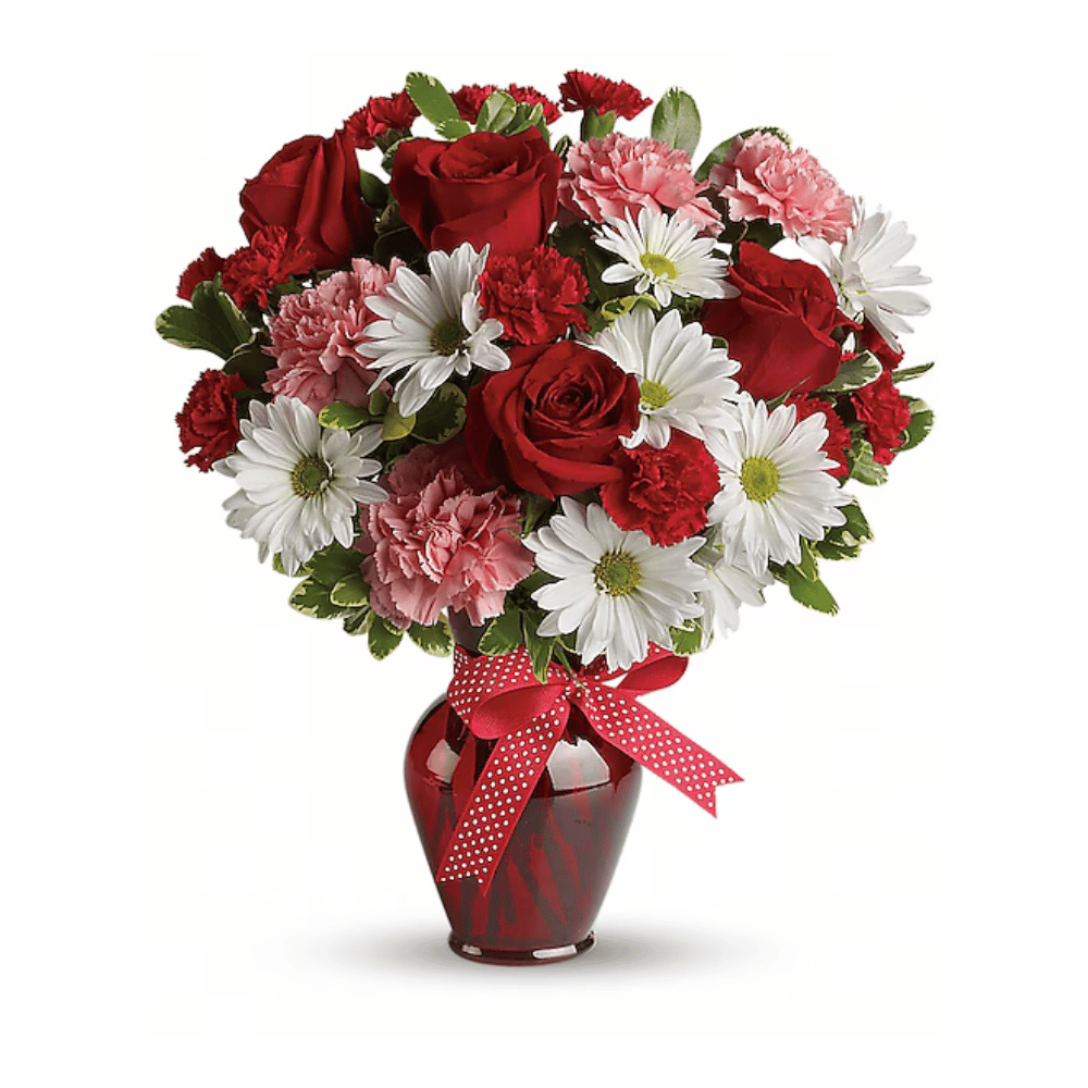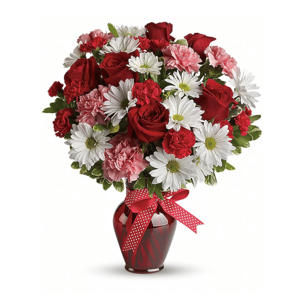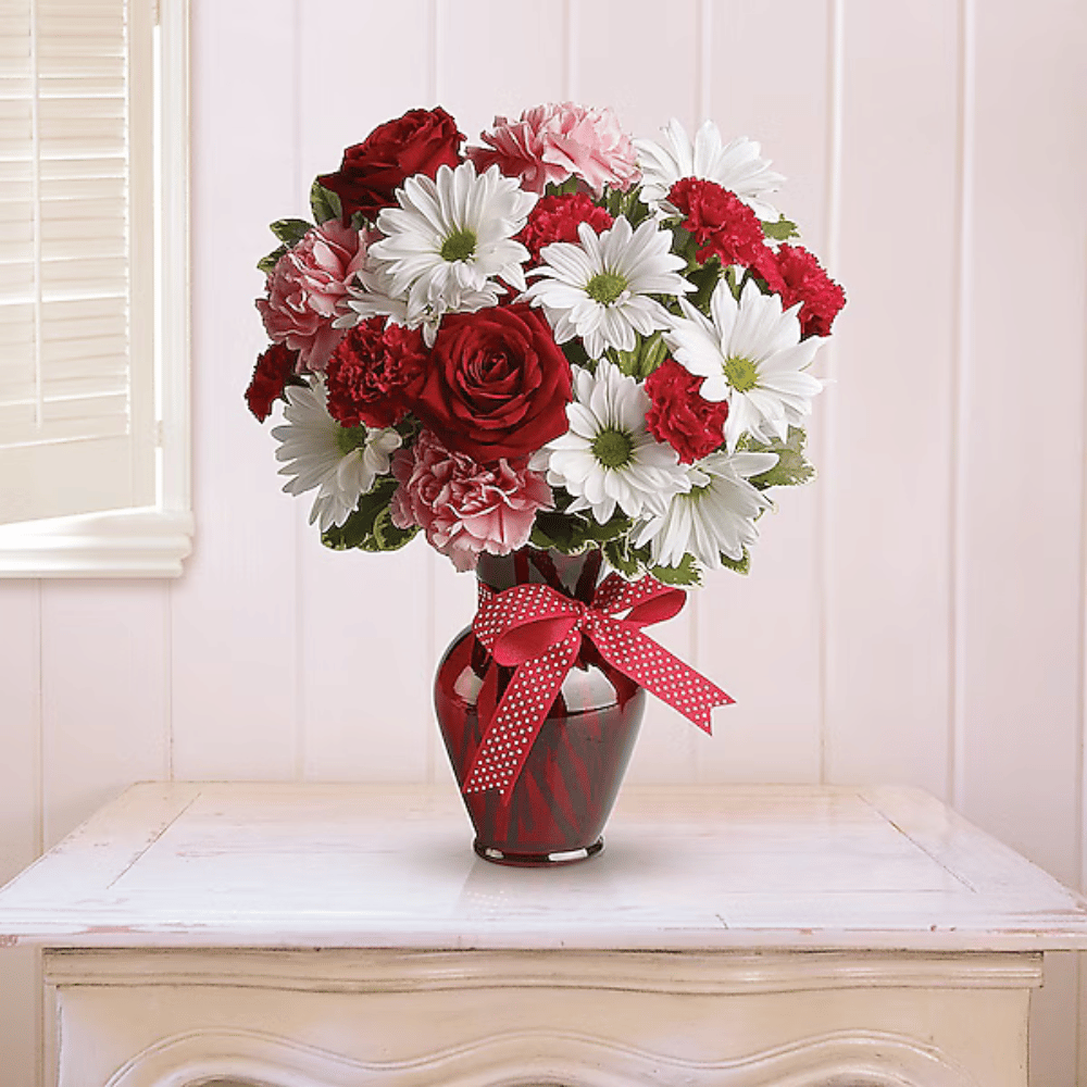 The charming bouquet includes white daisy spray chrysanthemums, pink carnations, red miniature carnations and red roses accented with fresh greenery in a stylish red vase.