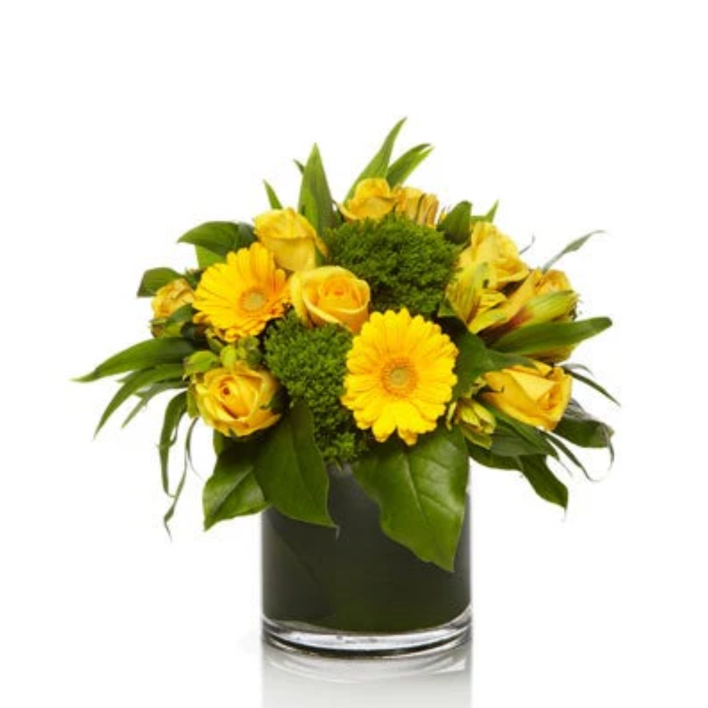 Bright and refreshing floral arrangement composed of lemon yellow blooms with bold green accents.