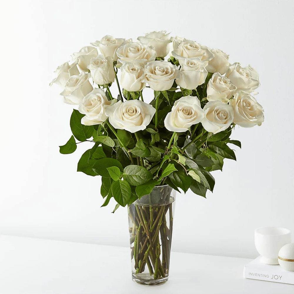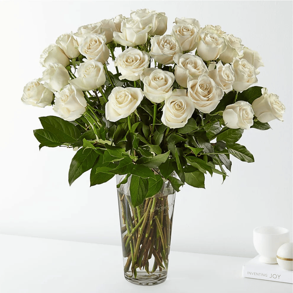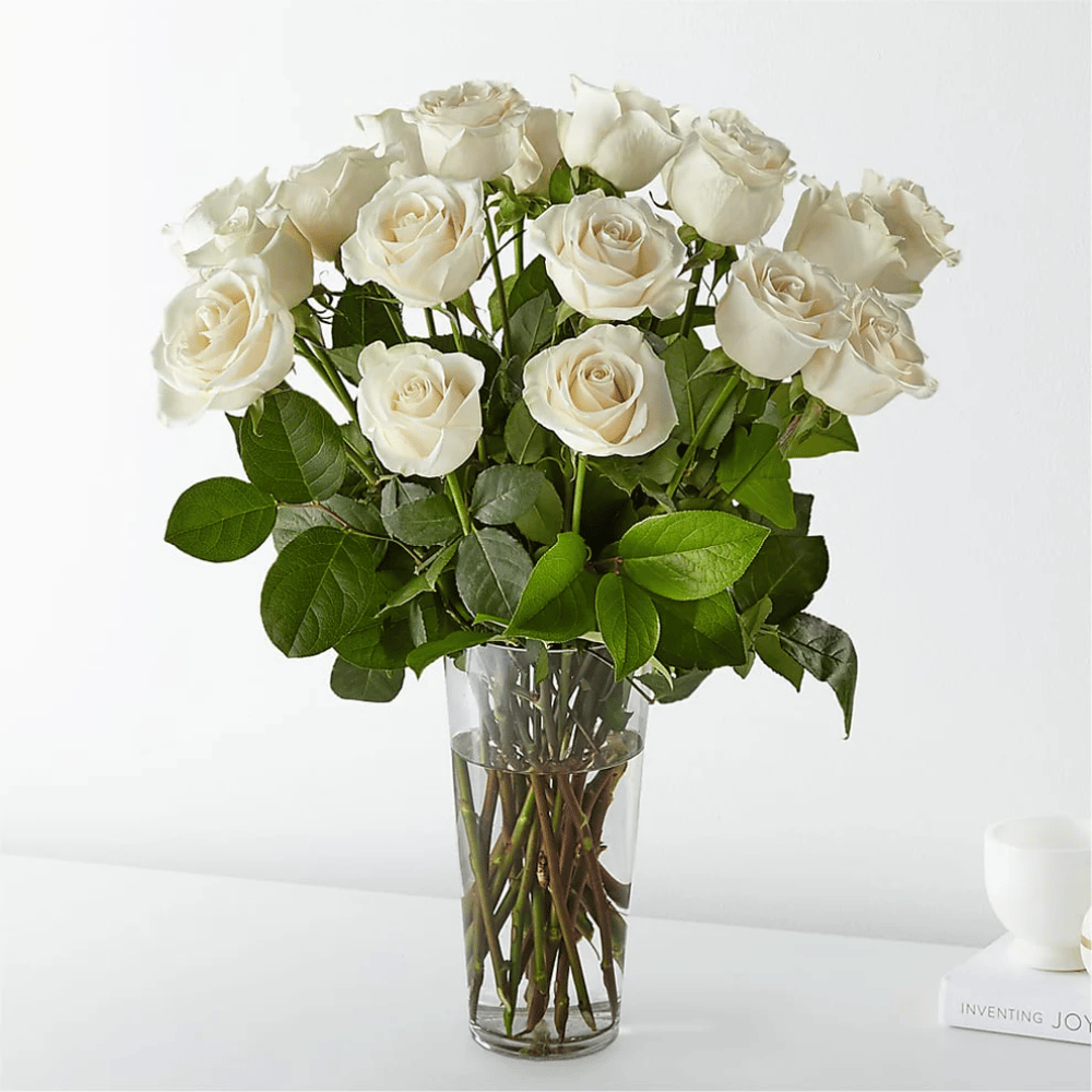 White roses are elegant, luminous, and beautifully accent any room. With a gorgeous selection of crisp white roses among fresh greenery, this bouquet is perfect for birthdays, anniversaries, or as a way to say, "I'm thinking of you."