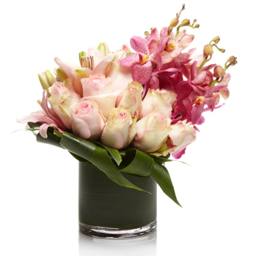 A contemporary floral arrangement featuring high-end blush and bright pink blooms, grouped by variety.