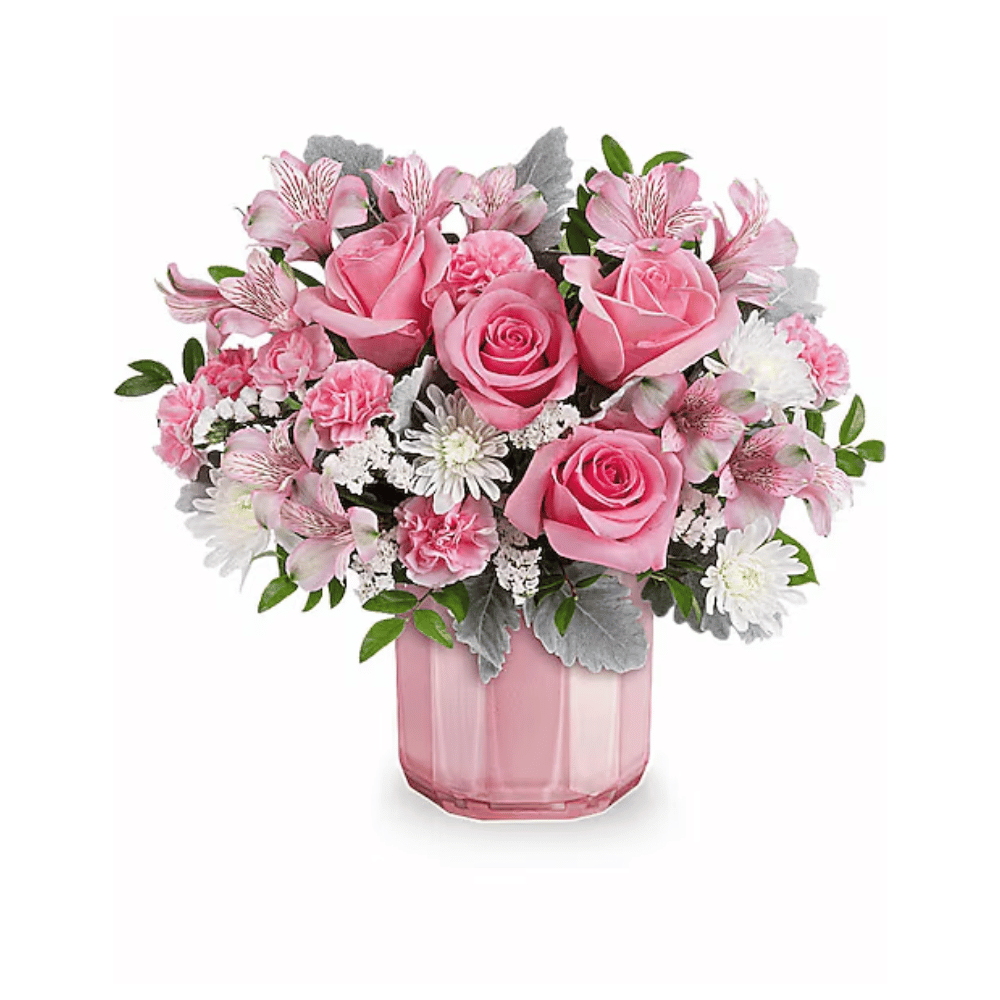 This charming Valentine's Day bouquet features pink roses, pink alstroemeria, miniature pink carnations, and white cushion spray chrysanthemums, arranged with dusty miller and huckleberry. It's delivered in the Blushing Gem vase.