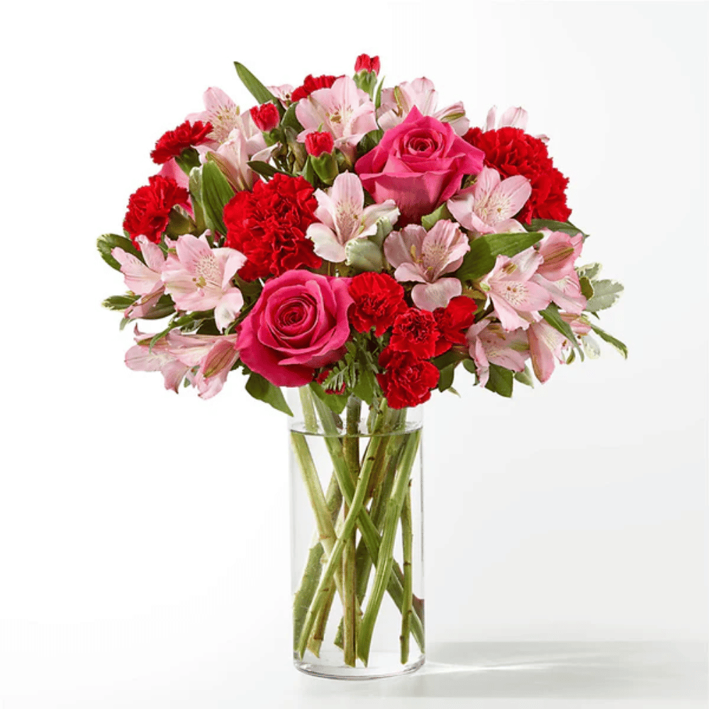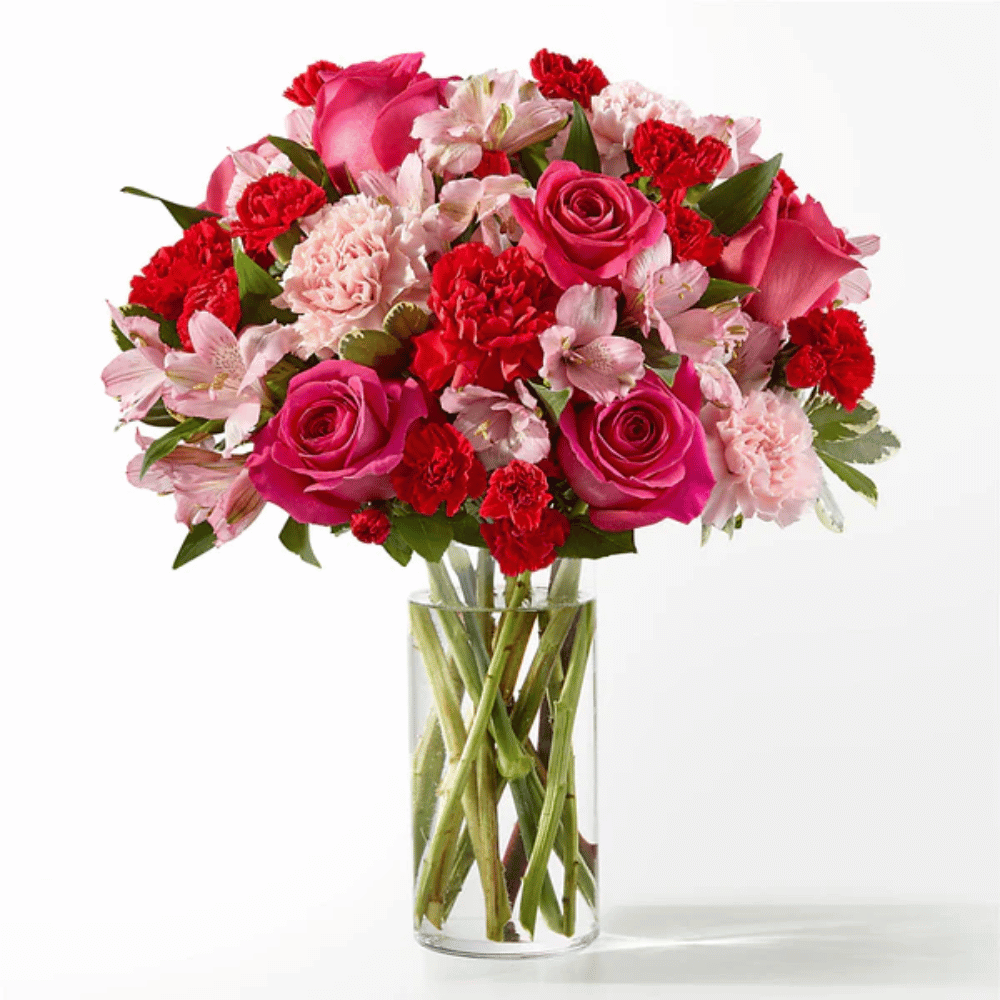 Blushing shades of pink blooms are nestled in lush greens to charm anyone's day. This bouquet is abundant with a classic assortment of pretty florals – roses, alstroemeria and carnations to name a few.