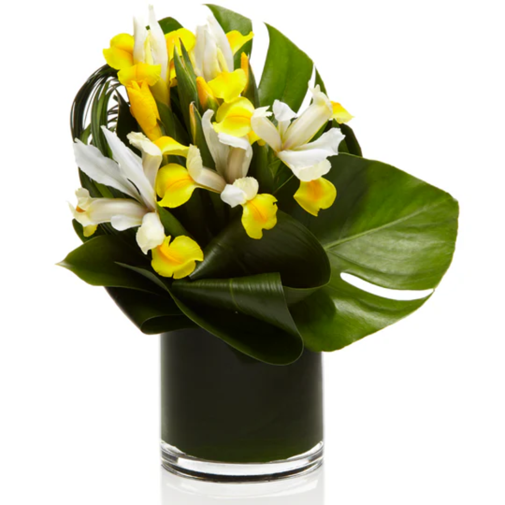 An exotic contemporary floral arrangement of premium yellow irises accented with tropical greenery.
